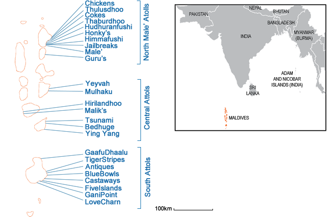 Los atolones centrales cubren una gran cantidad de islas, algunas expuestas al oleaje suroeste y otras al sureste. La región cuenta con algunas zonas de buena calidad que son adecuados para la mayoría de los surfistas. Las islas muy pintorescas salpicadas de resorts de lujo y zonas de gente local significa que los turistas pueden combinar el deporte con unas copas en un bar del resort de lujo o visitando las islas locales.